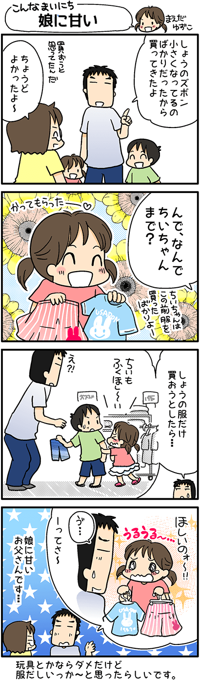 こんなまいにち 36話「娘に甘い」 せがまれるとついつい。 More from my siteこんなまいにち 256話「お祭りのくじ②」こんなまいにち 255話「お祭りのくじ①」こんなまいにち 254話「お祭りにいこう!」こんなまいにち 253話「暗闇は危険」こんなまいにち 252話「待ちに待った」こんなまいにち 251話「お下がりコーデ」